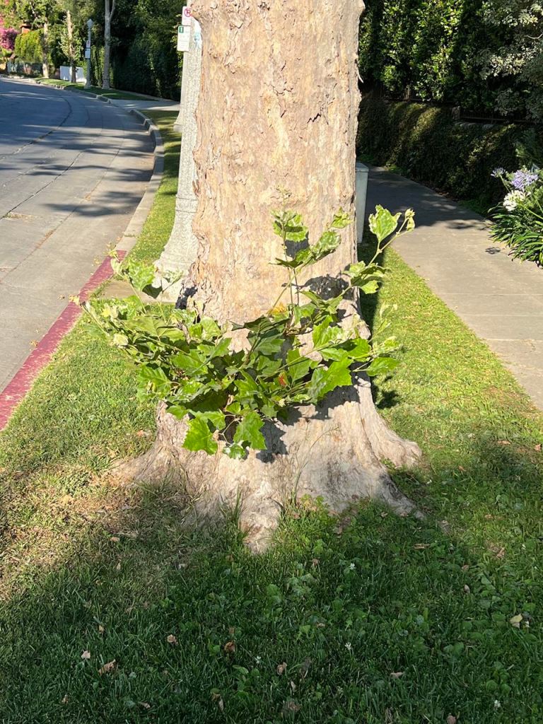 Tree suckers are miniature tree-looking shoots at the bottom of your tree’s trunk; they can sprout if your tree is stressed and is exerting energy to grow more branches. When you first see tree suckers developing, it’s important to remove suckers and sprouts. If you leave tree suckers to continue to grow on the tree, it can stunt the growth of healthy roots. Please tell your gardener to remove them!