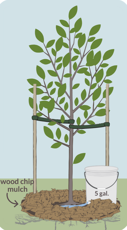 For the first three years after planting, all trees need regular water to get established. Don’t rely on lawn sprinklers — they do not soak soil deeply enough to encourage a healthy, deep root system for your tree.