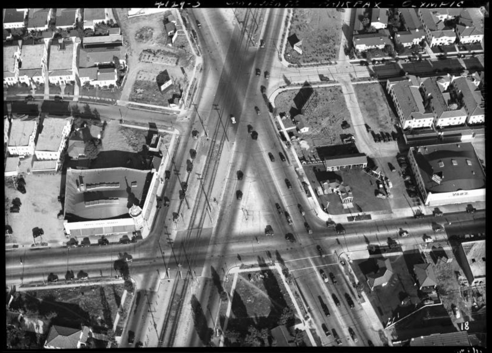 Aerial view of Fairfax, San Vicente and Olympic intersection, 1936