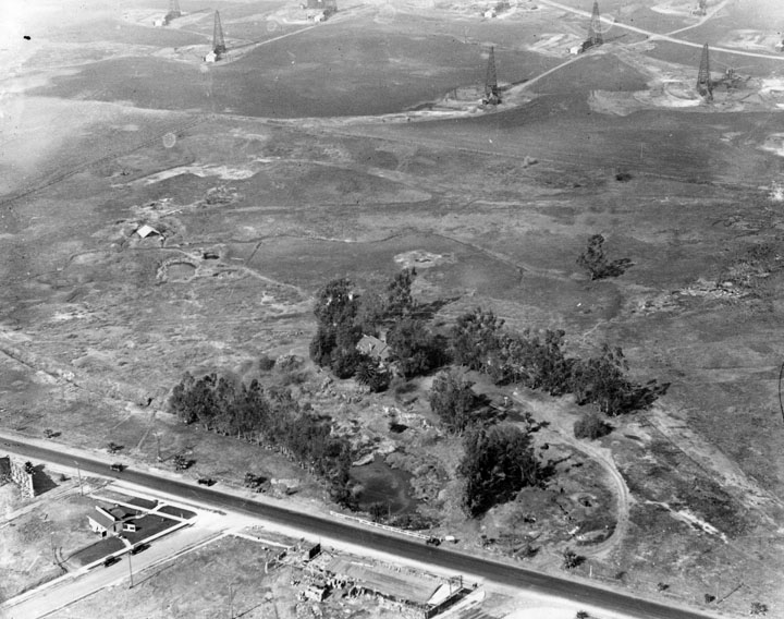 Aerial view of La Brea tar pits and oil derricks, circa 1924