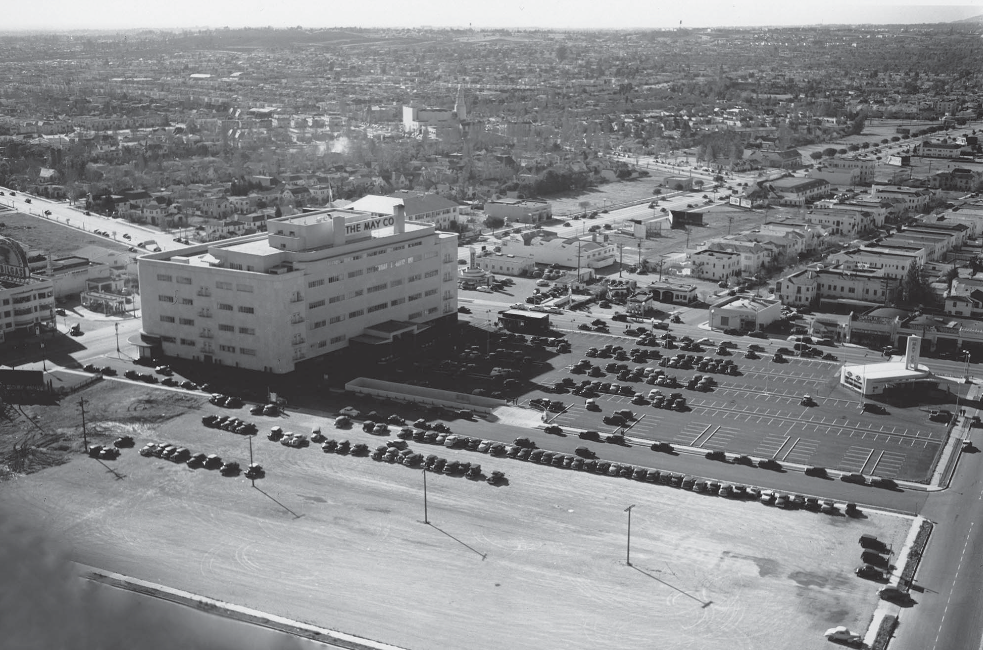 Aerial view of original May Company building and gas station, 1940