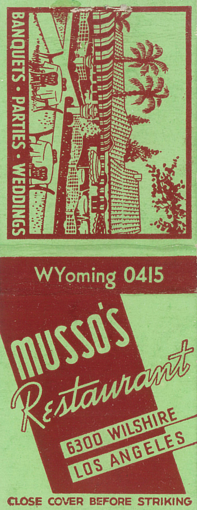 Musso’s Restaurant matchbook cover, circa 1930.