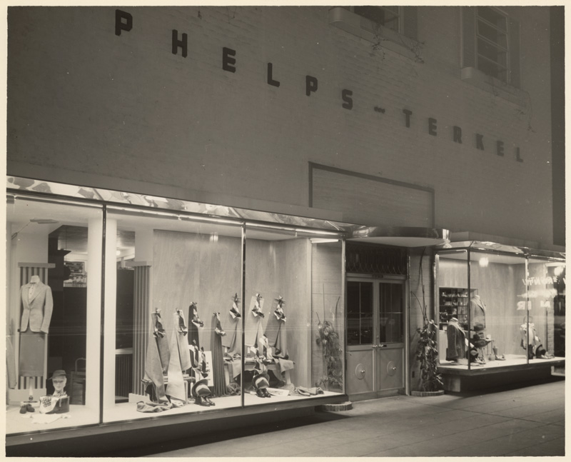 Nighttime view of Phelps Terkel display windows, circa 1936